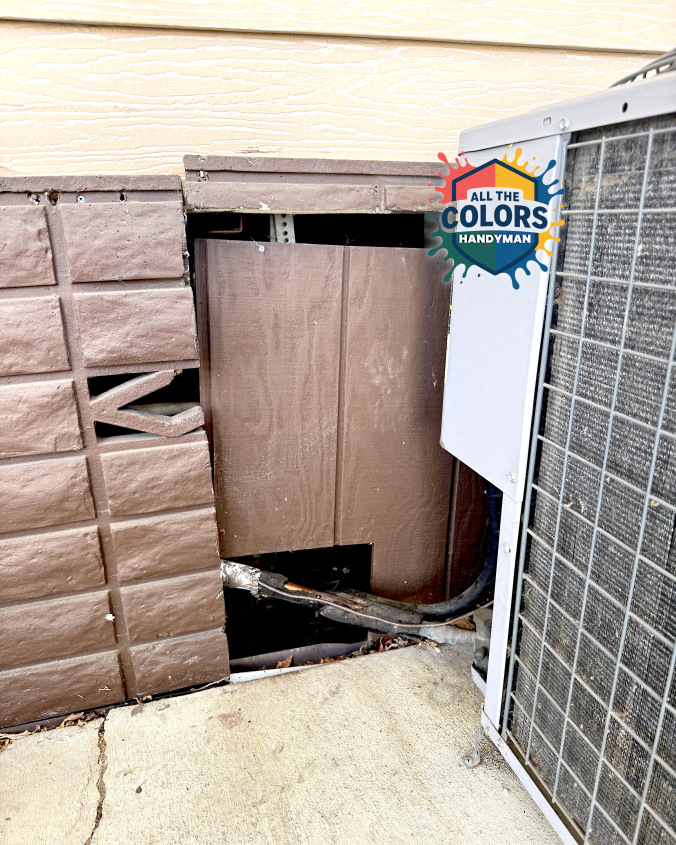 There was a critter-sized hole in the skirting of this mobile home. We filled it with expanding foam and painted it to blend in.